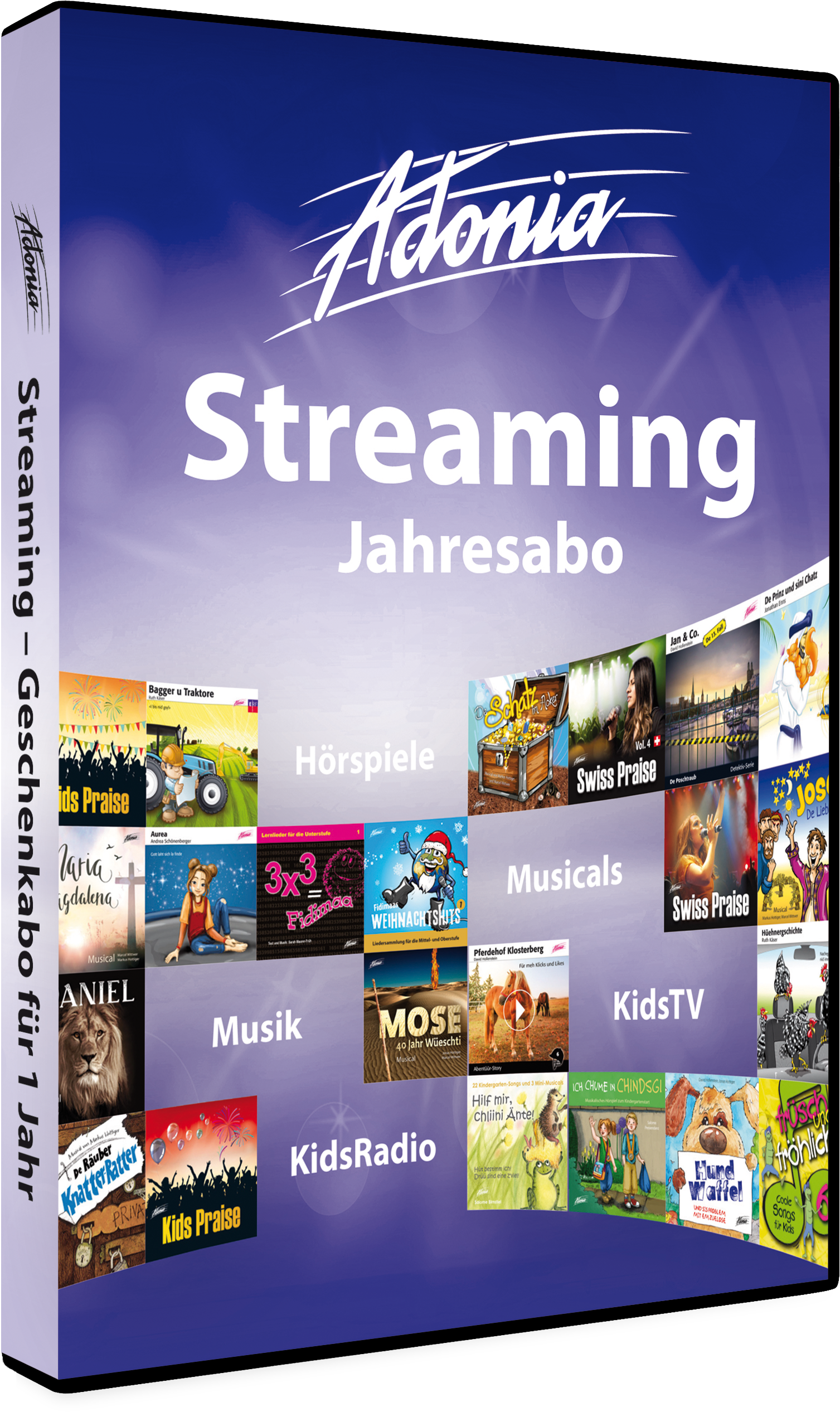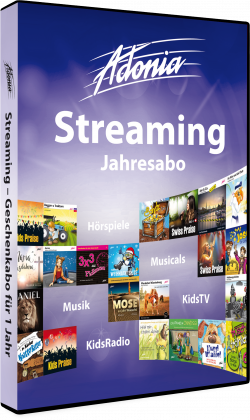 Mit diesem Abo erhalten Sie unbeschränkten Zugang zu allen Hörspielen, Musikproduktionen, KidsTV- und KidsRadio-Sendungen von Adonia. Zum Abspielen benötigen Sie die App «Adonia-Player» (Android, iOS) oder einen Internetbrowser.