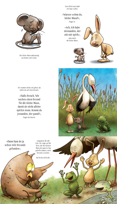 Die kleine Maus sucht einen Freund zum Spielen. Doch es findet sich niemand. Zum Glück helfen ihr der Hase, der Storch, der Frosch und der Fisch beim Suchen. Zusammen sollten sie doch eigentlich einen Freund für die kleine Maus finden …