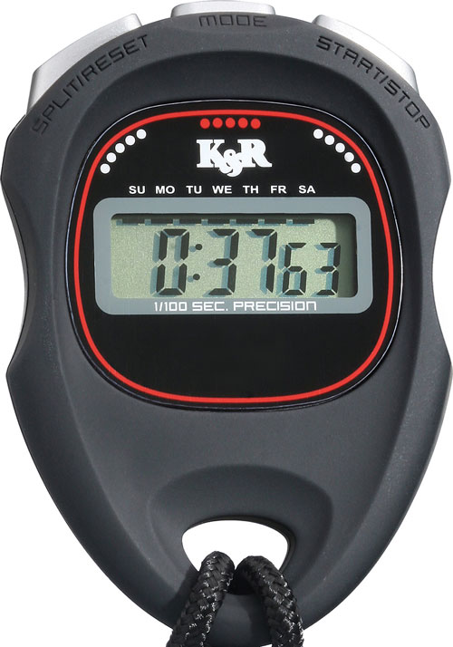 Die Stoppuhr für alle Zwecke. Zwischenzeitfunktion, 1/100 Sekundenanzeigen, Datum, Uhrzeit, Alarm. Gummiertes Kunststoffgehäuse, mit Anhängekordel. Grösse: 54 x 78 x 17 mm, Gewicht: 31 g.